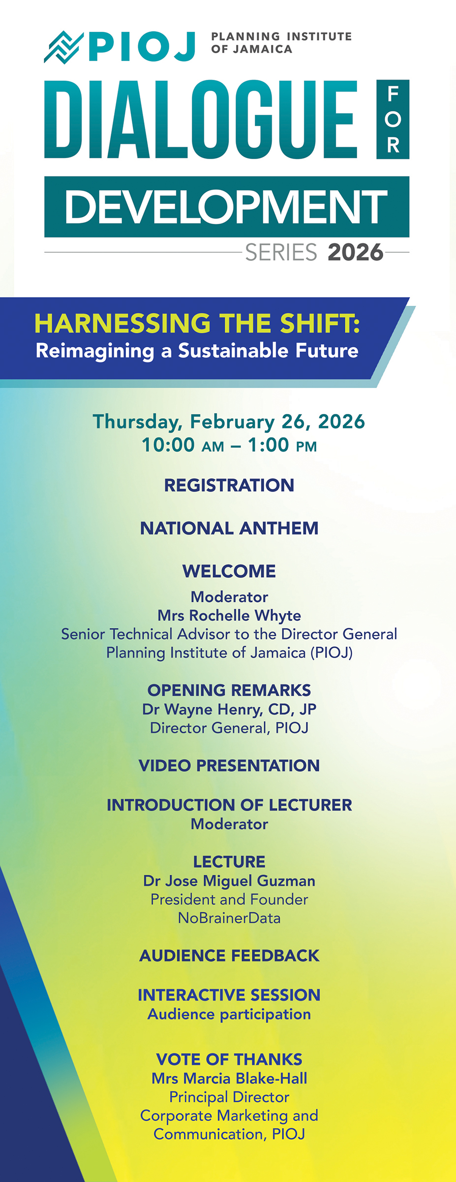 The Planning Institute of Jamaica (PIOJ) will host the return of its Dialogue for Development Distinguished Lecture on Thursday, February 26, beginning at 10:00 a.m., under the theme “Harnessing the Shift: Reimagining a Sustainable Future.” The lecture will focus on potential development actions to address Jamaica’s current demographic trends, which are marked by stagnant population growth and an ageing population.